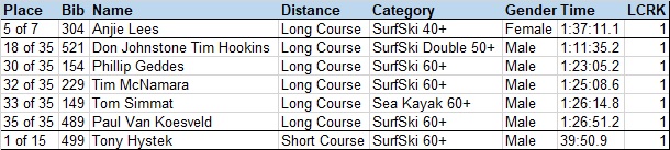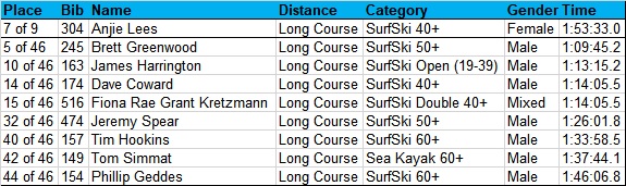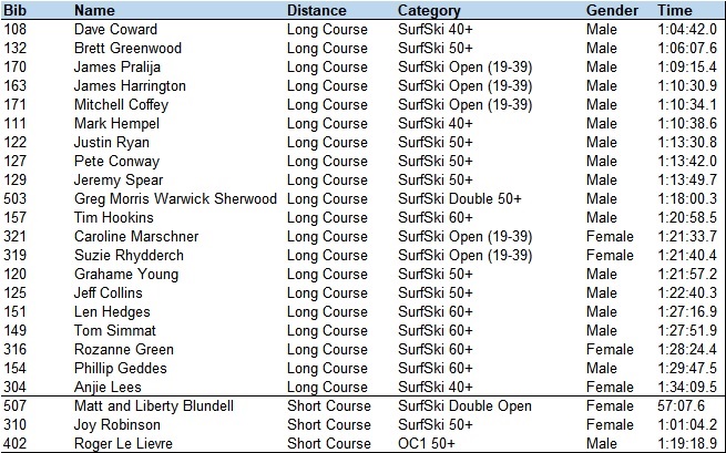 Congratulations to Georgia Sinclair 1:09:31 first female across the line in the long course surf ski and to Brett Greenwood 1:03:02 first male.