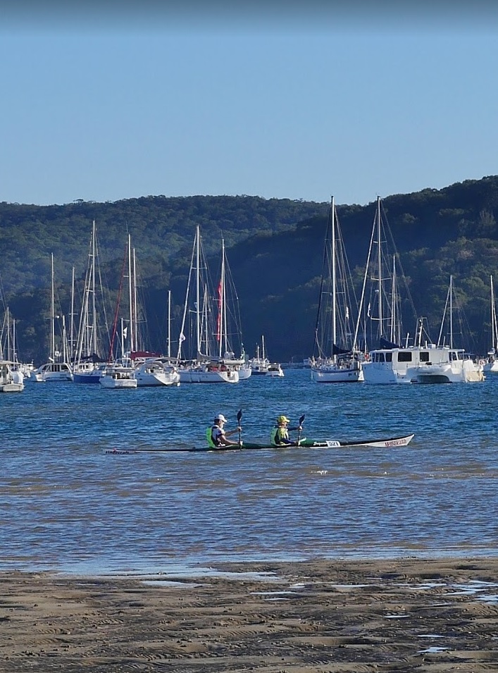 The start was in the channel opposite Haystack Point. The course was clockwise across to the South of Scotland Island keeping outside all the moored boats. Skis took a course close to the boats all the way round the island and the conditions and chop changed slightly as you went around. Long course did a lap completely around Scotland Island first and then headed North to Woody Point and then on to Longnose Point. At each of those was the pink PaddleNSW cones. Then there was the long run back to Rowland Reserve with the breeze behind and some boat washes to contend with. The finish was between the two Carbonology banners on the beach at Rowland reserve. The short course was the same except the was no first lap around Scotland Island. A picturesque, different course and it was good to see a wide range of paddlers from the grizzly old regulars like Paddlepop Gillet and Gazza Gilchrist to plenty of keen newcomers. Apparently there were still opportunities to get lost and take the wrong course!