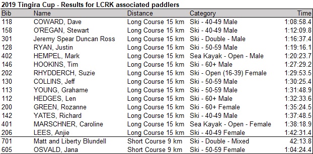With most series winners already known and some paddlers overseas, entries were probably a bit down on earlier races but still healthy enough. A good proportion of the gun ski paddlers had entered but none of LCRK’s “gunnish” ski paddlers were present. LCRK paddlers there were the five oldest paddlers entered (Phil Geddes, Tim McNamara, Tom Simmat, Tim Hookins and me, all of whom clear the 60+ age bar by more than 10 years) plus youngster Tony Hystek, also in the 60+ age group, and the much younger Don Johnstone (paddling with Tim Hookins) and Anjie Lees, preparing for her upcoming Avon tilt. All had entered the long course with the exception of Tony Hystek who needed to get back to base quickly to return to his event coordinating role with Maya Gibson and the BWP.