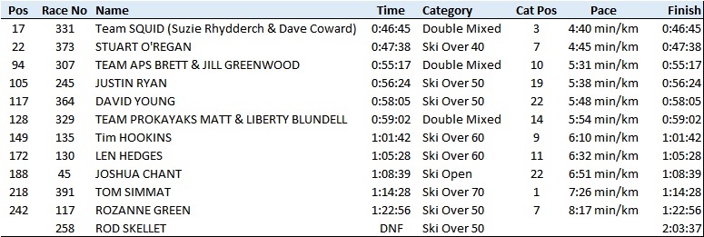 We have to take note of the performances of the very young and the very old! There were 7 paddlers in the over 60s skis, led by Gary Hancock back at his best in 1 hr 12 minutes and 22 seconds, ahead of Peter Grimes and the irrepressible Paddlepop Gillett on the virtual podium. At the other end of the spectrum in the under 18 skis was Fletcher Armstrong in an amazing time of 1hr 9 minutes and 20 seconds over Ben Rees, Ashby Allen and Ziko Veseley.