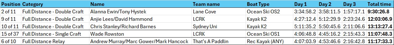 Most LCRK paddlers managed the day OK, including the less experienced and hats off to the K1 and K2 crews, particularly Dymtry and Naomi/Alex who made it seem effortless, especially through the big open sections where the side chop was in excess of 30cm. It was wonderful crossing the finish line, getting friendly faces to help and listening to Tony’s favourable commentary on the finishers.