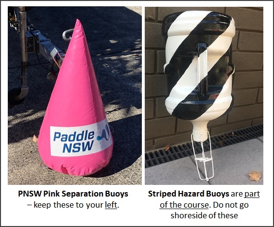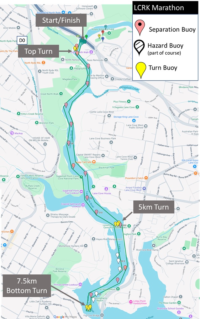 As can be seen from the map above, the Lane Cove River has lots of twists and turns, and sections which are navigable at high but not low tide. Last time, course length was 'just right' - due to it being set with both separation buoys and ALSO with Hazard buoys which are part of the course. The Hazard Buoys are black and white striped - signifying no corner cutting, do not go shoreside! Note there will be no portage this year.