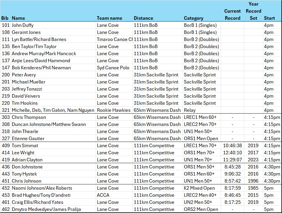 And the table below shows LCRK paddlers for the 2025 start with Boat Numbers for tracking