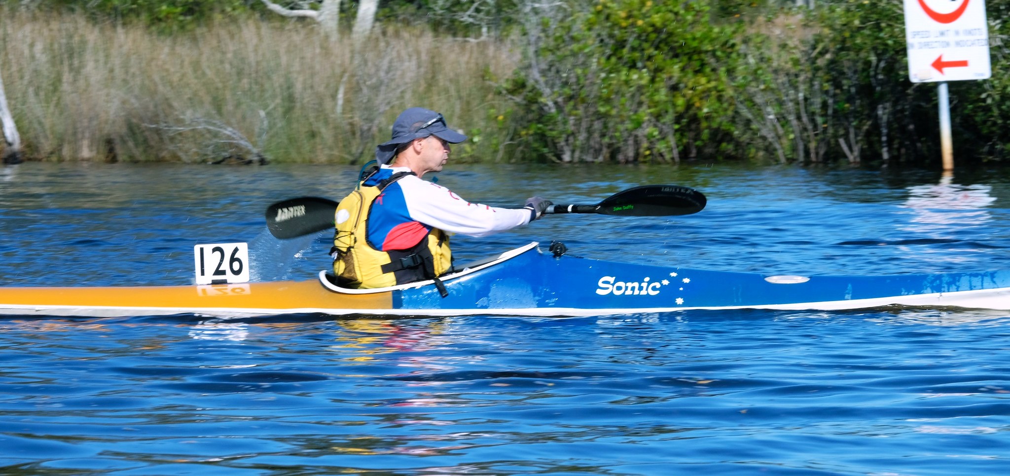 Held on the section of river, from near the mouth, to Lions Park, in the shadows of the Railway Bridge in Wyong. Consequently, there are three laps - two of about 11.3km - and a shorter lap to make up the 30km. The "Bottom" turn is the Red and White channel marker, near the mouth, ("Red Pole") - the "Top" turn is a yellow 20 litre drum, 100 metres downstream of the Start/Finish Line. The third, and last turn, is a very large yellow buoy, (with a cage on top), over a kilometre upstream from the first turn. See diagram below. This is an excellent location for Photographers in the latter stage of the Event.