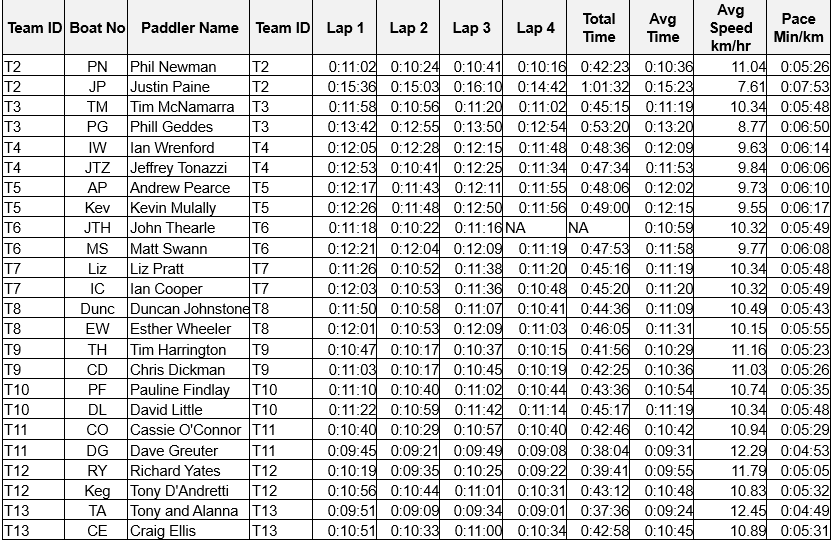 A couple of timing observations. John D and Chris D, whose teams started on different handicaps, paddled their first 2 laps to exactly the times. Also Ian H paddled his two downstream laps to exactly the times.